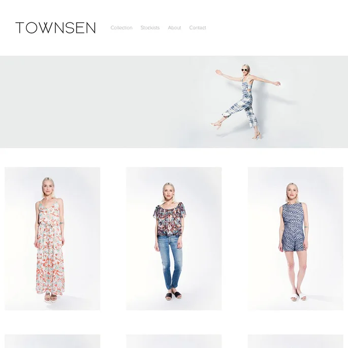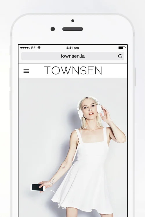 With Townsen Nina wanted the standard collection photographs to have something extra, so when you hover over a photograph you get a different angle. We also pushed the website to the edges of your monitor and tweaked the brand logo on mobile only.
